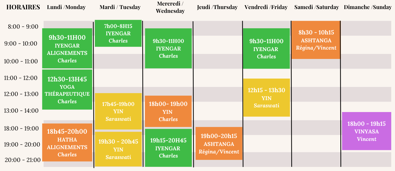 Seuls les cours en ORANGE sont incluent avec les cartes et forfaits proposés par le Studio.